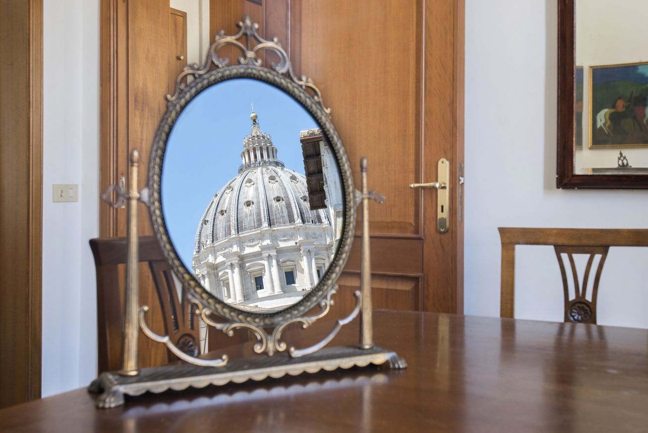 La caratteristica unica della casa è che a pochi metri di distanza si erge in tutta la sua grandezza e bellezza la Cupola di S. Pietro, che si riflette in uno specchio situato nel salone. Affacciandosi alle finestre, si ha l’illusione di poterla toccare.